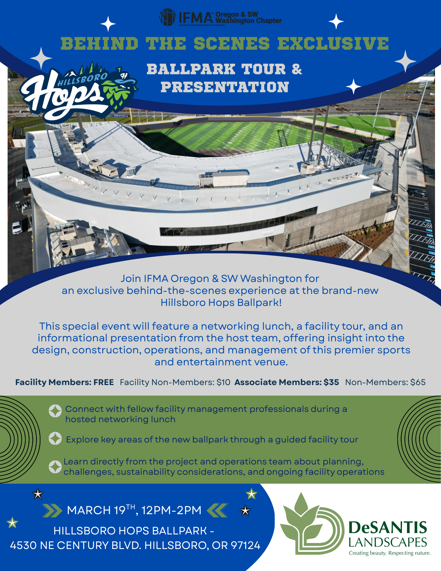 « All Events Hillsboro Hops Ballpark Tour & Presentation March 19 @ 12:00 pm - 2:00 pm Free – $65.00 « Women’s Connect Symposium » Add to calendar Google Calendar iCalendar Outlook 365 Outlook Live Details Date: March 19 Time: 12:00 pm - 2:00 pm Cost: Free – $65.00 Tickets The numbers below include tickets for this event already in your cart. Clicking "Get Tickets" will allow you to edit any existing attendee information as well as change ticket quantities. Facility Professional $0.00 17 available Decrease ticket quantity for Facility Professional - Quantity Increase ticket quantity for Facility Professional + Facility Professional Non-Member $10.00 17 available Decrease ticket quantity for Facility Professional Non-Member - Quantity Increase ticket quantity for Facility Professional Non-Member + Associate Members $35.00 17 available Decrease ticket quantity for Associate Members - Quantity Increase ticket quantity for Associate Members + Non-Member $65.00 17 available Decrease ticket quantity for Non-Member - Quantity Increase ticket quantity for Non-Member +